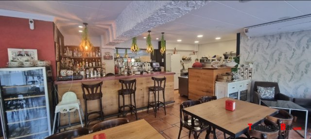 Terraza: 4 mesas + 2 mesas adicionales en la entrada, con sol durante la mayor parte del día.