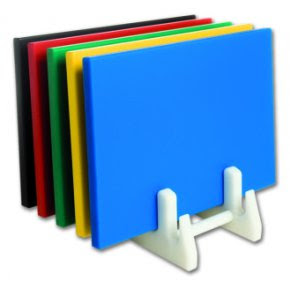 En las cocinas profesionales hay distintos colores de las tablas de corte, destinadas a los distintos alimentos y su estado.
